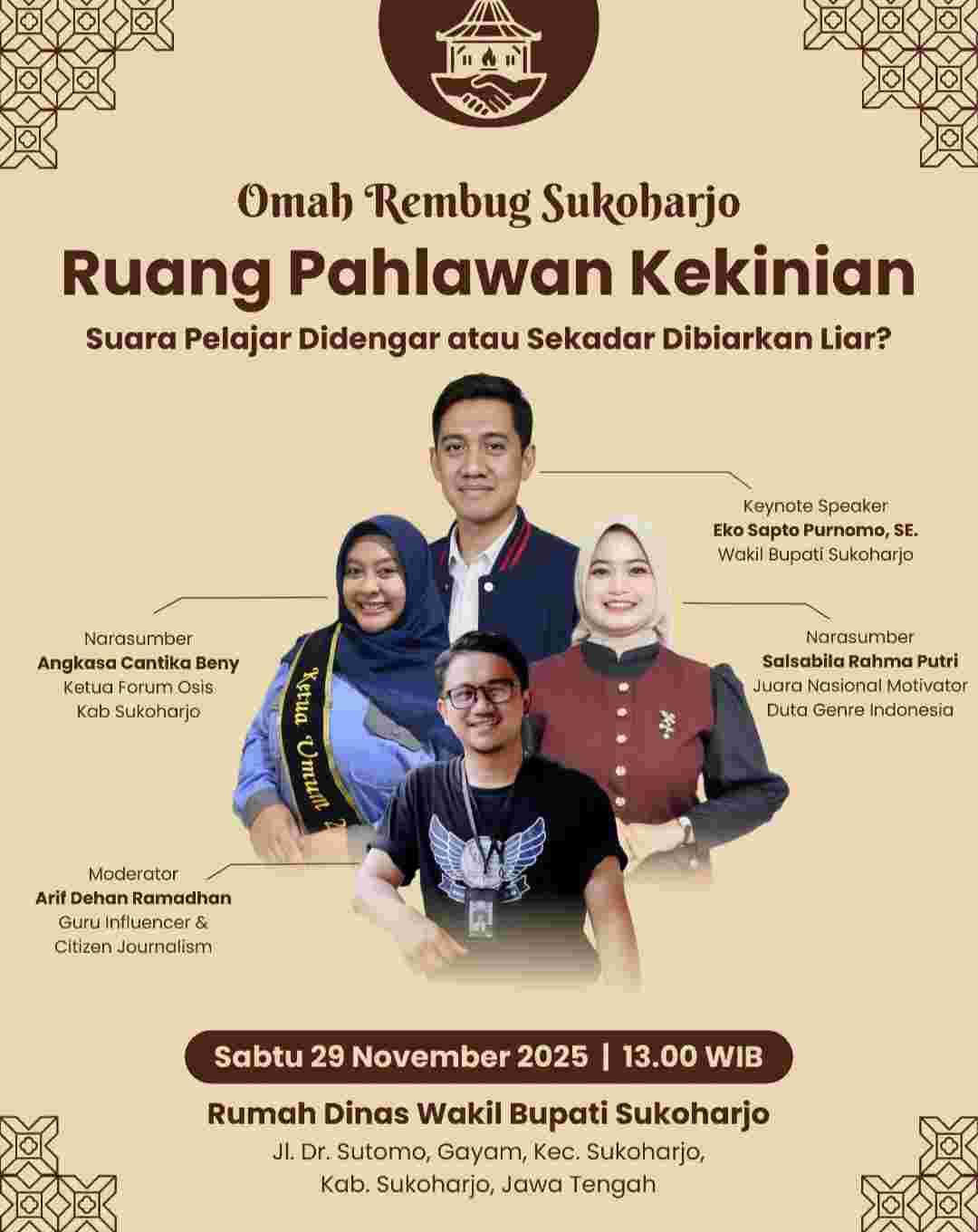 Kegiatan ini akan digelar pada Sabtu, 29 November 2025 pukul 13.00 WIB di Rumah Dinas Wakil Bupati Sukoharjo, menghadirkan 60 pelajar perwakilan dari OSIS SMA, SMK, dan MA se-Kabupaten Sukoharjo.